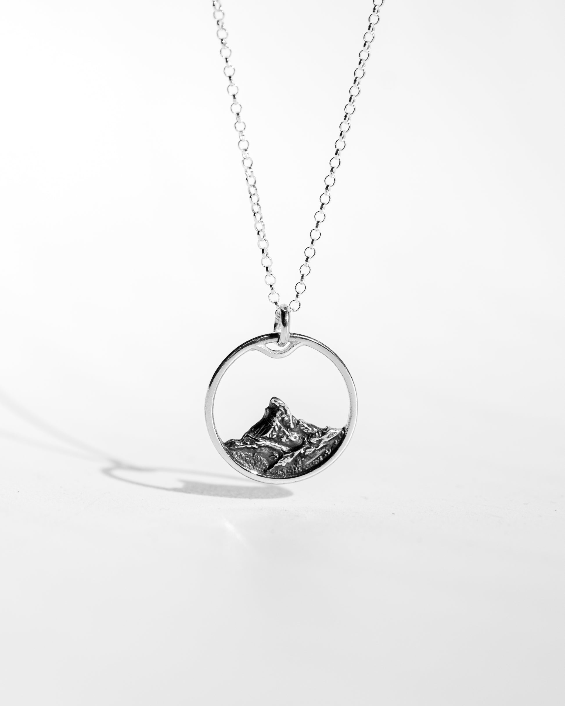 O Matterhorn ou monte Cervino ergue-se solitário na fronteira da Suíça com a Itália, com sua face piramidal que desafia montanhistas há gerações. Este colar captura o contorno inconfundível da montanha mais famosa dos Alpes, onde cada aresta conta histórias de conquista e contemplação.