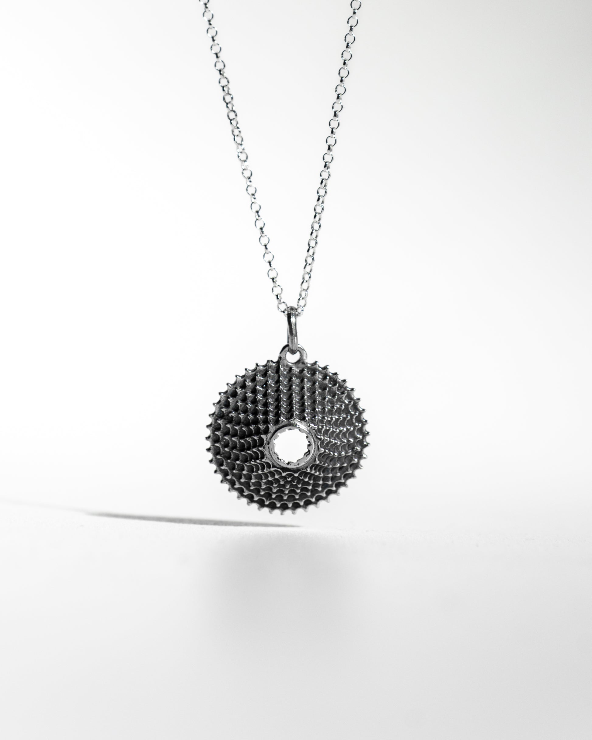 Inspirado em uma das combinações mais utilizadas no ciclismo de montanha, este pingente de cassete (catraca/pinhão) traz em seu design a representação de 8 velocidades, sendo 15 dentes na menor engrenagem e 42 dentes na maior.